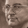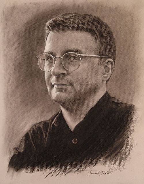 Description: A charcoal head and shoulders portrait drawing of Navy Commander Curtis. He is wearing glasses and a black shirt.